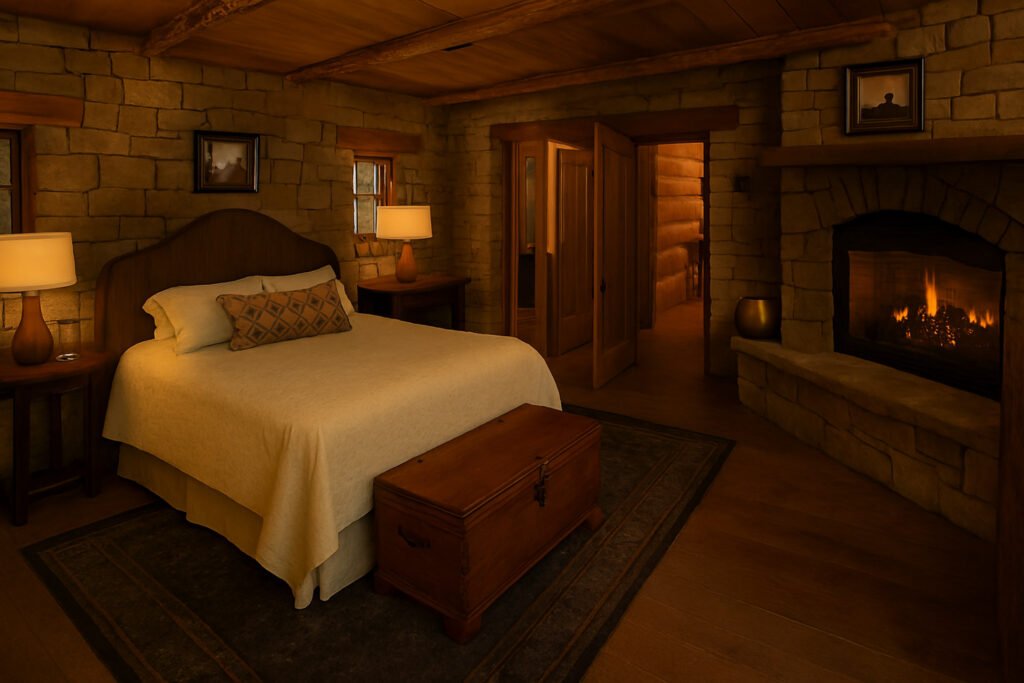 A stone fireplace serves as both a visual anchor and a practical feature in a rustic bedroom, providing warmth and a natural gathering point. Earthy accents in materials like hammered copper, wrought iron, or terracotta introduce subtle color variations while maintaining the natural aesthetic.